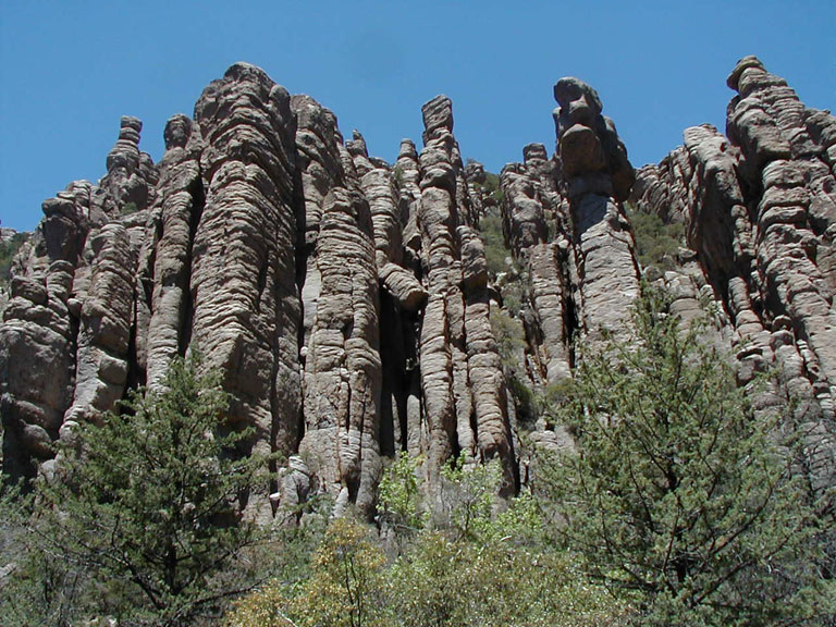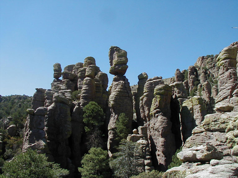 In the late 1800s the Chiricahua Mountains were the home of the Chiricahua Apaches and their chiefs Cochise and Geronimo. The rock formations are compressed volcanic ash from a volcano that erupted some 25 million years ago, displacing more than 100 cubic miles of material with an explosion 1000 times the force of the Mt. St. Helens eruption, creating a caldera (volcanic crater) 13 miles in diameter and spreading a 2000-foot deep layer of volcanic ash. Water and ice have eroded much of the compressed ash, leaving thousands of these formations.